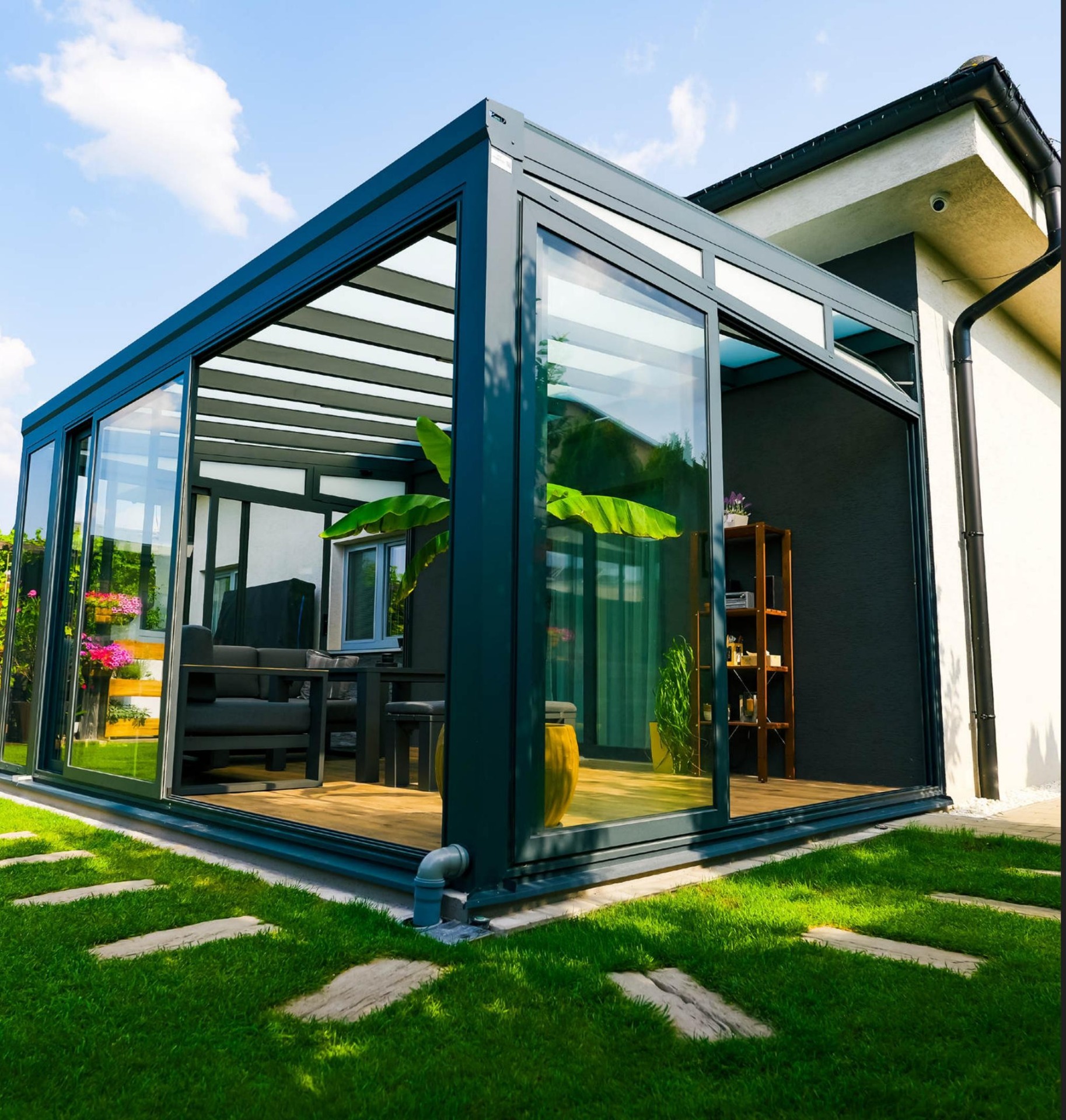 - Hliníkové zimné záhrady so zasklením – moderné, odolné a estetické riešenie, ktoré vám umožní využívať priestor po celý rok.